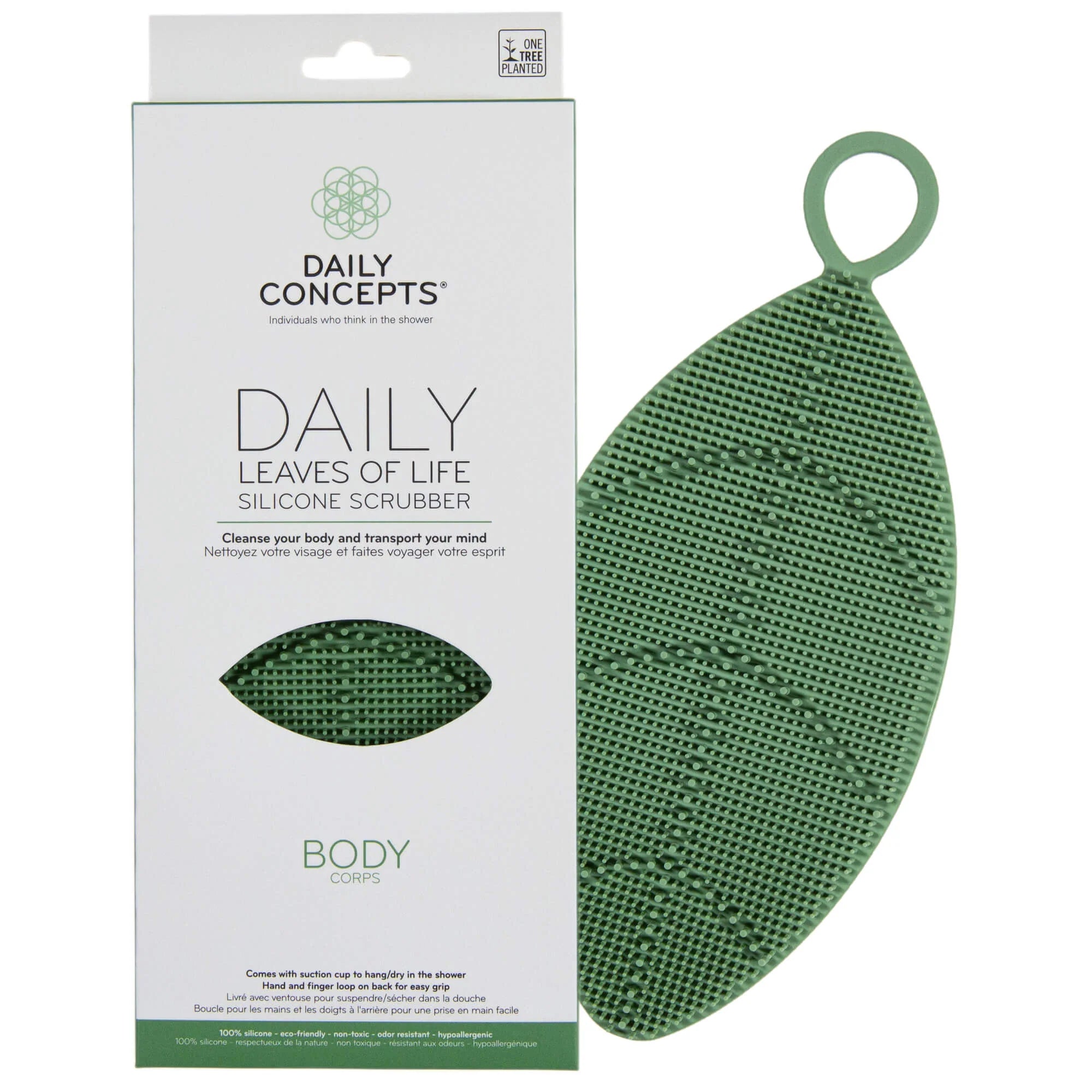 The Daily Leaves of Life Silicone Scrubber – BODY is shaped to cleanse your uniquely beautiful body and all of its parts. The silicone bristles exfoliate and massage your chest, shoulders, arms, legs and back to leave your mind relaxed and your skin feeling fresh, clean and smooth. Included with the BODY scrubber is a suction cup to hang, dry and keep your body scrubber organized and looking beautiful in your shower.